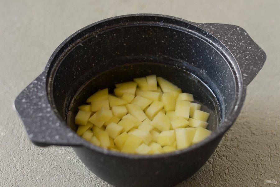Картошку очистите от кожуры, нарежьте на мелкие кубики. Отварите в кипящей подсоленной воде 5-6 минут. Затем слейте воду.