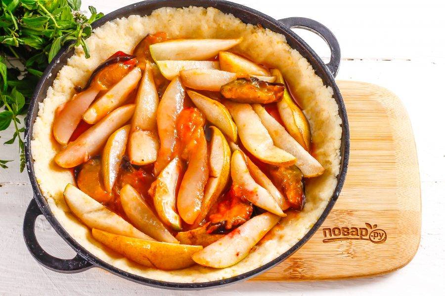 В середину формы на тесто выложите карамелизированную фруктовую нарезку и аккуратно распределите ее. Поместите форму в духовку на 25-30 минут.