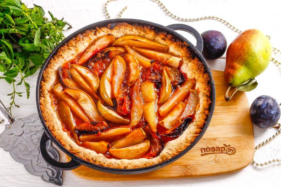 Безумно вкусный песочный пирог с грушами и сливами буквально тает во рту! Ломкая основа рассыпается, прекращаясь в крошку, пропитанную соком фруктов в карамели. Подавайте его с чаем, кофе, латте.