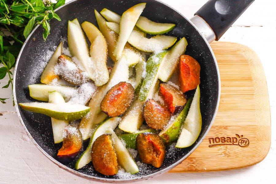 В это время фрукты очистите от семян и семенных блоков, промойте и нарежьте ломтиками. Выложите на сковороду вместе с сахарным песком. Потушите примерно 3-5 минут до карамелизации.