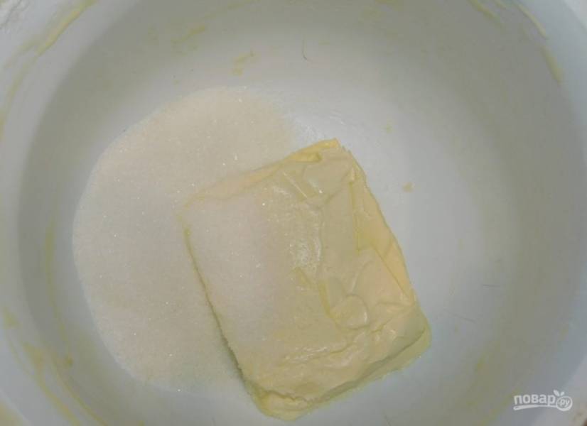 Для приготовления песочного теста взбейте мягкое сливочное масло с сахаром.