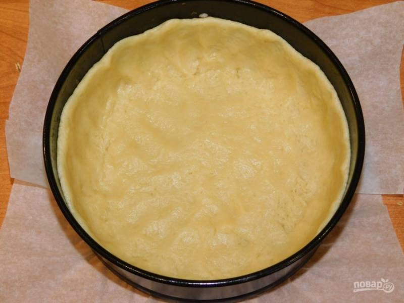 Тесто выложите в форму для выпечки. Распределите по дну, формируя бортики. Уберите в холодильник на 30 минут.