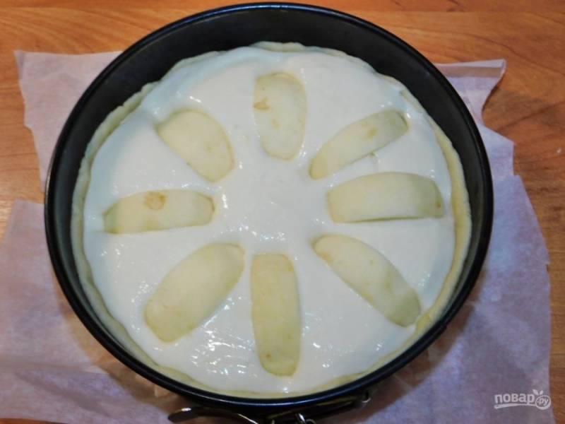 Вылейте начинку на застывшее тесто. Сверху выложите яблоки.