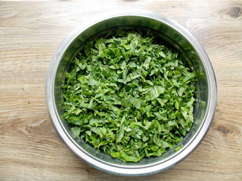 Включите духовку разогреваться до температуры 180 градусов. Чистый щавель порежьте тонкой соломкой и выложите в миску.