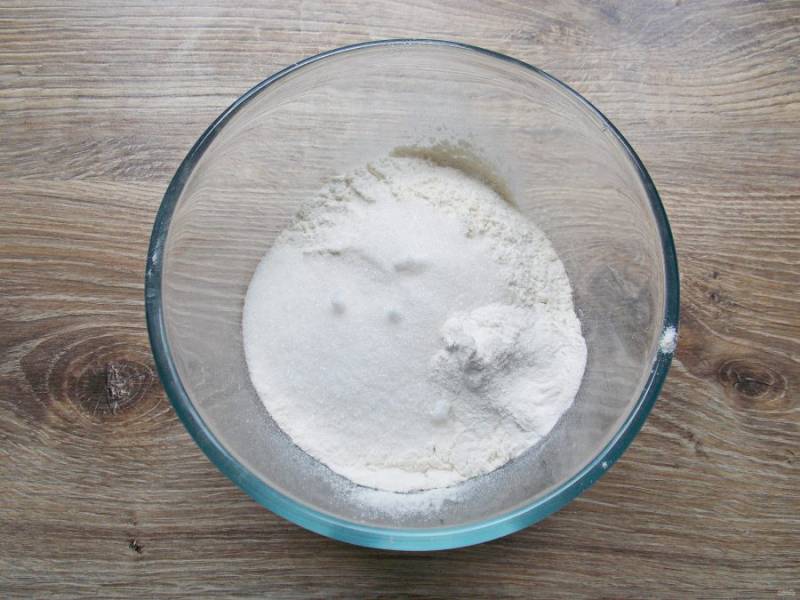 В миску просейте муку, добавьте сахар и разрыхлитель, перемешайте.