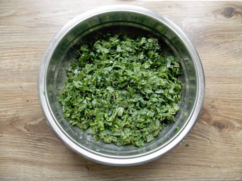 Перемешайте и помните щавель, чтобы он стал мягким, но не сильно пустил сок.