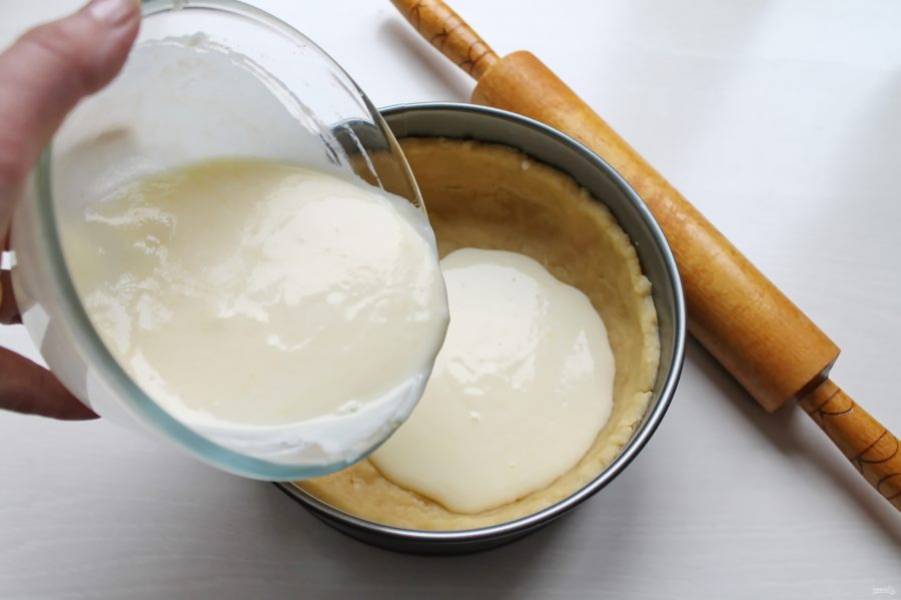 Тесто выложите в разъемную форму диаметром 20 сантиметров и распределите тонким слоем по дну и бортикам.
