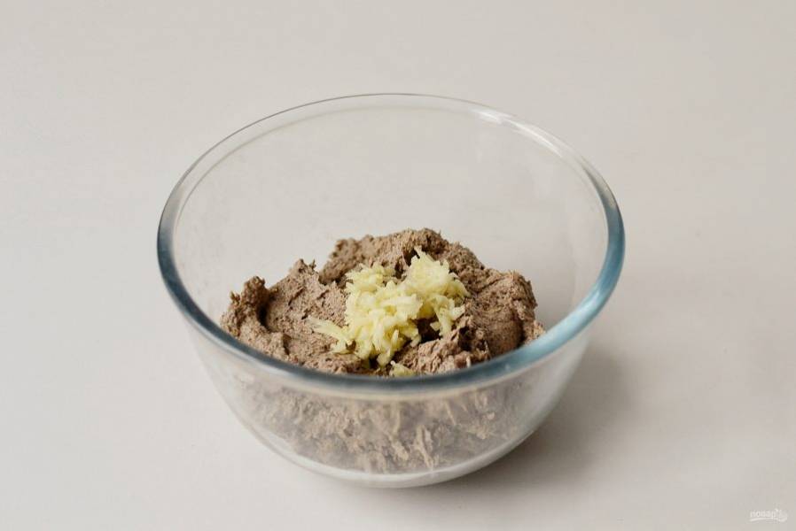 Добавьте жареные грибы с луком и специи. Еще раз измельчите все до однородной массы. Добавьте в массу соль, сахар и уксус. Раздавите чеснок, перемешайте. Оставьте массу на пару часов в холодильнике настояться.