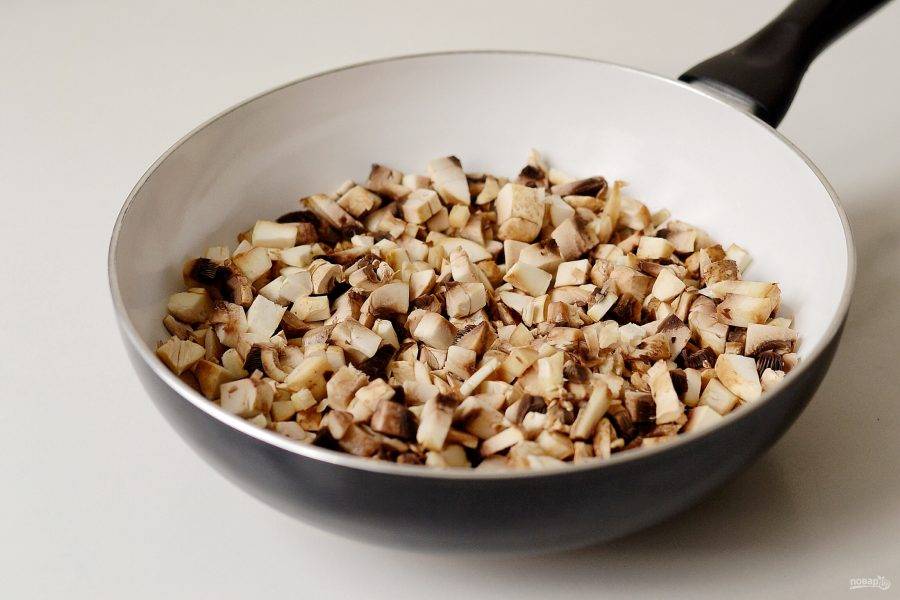 Добавьте порезанные кубиками шампиньоны. Обжарьте их до испарения лишней жидкости.