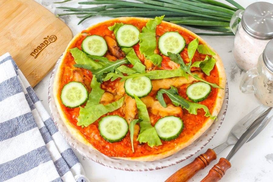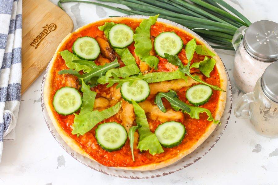Промойте свежую зелень и огурец. Нарежьте огурец кружочками, а листья салата нарвите и выложите на пиццу.