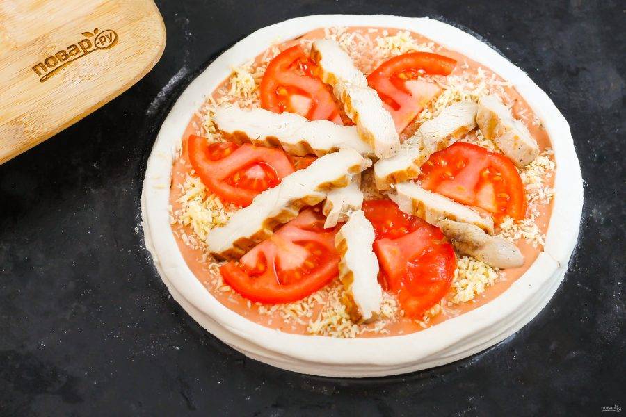 Нарежьте поджаренное куриное филе ломтиками и выложите на заготовку.