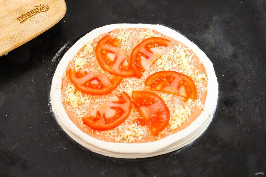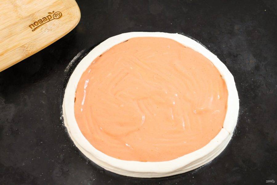Раскатайте слоено-дрожжевое тесто, обрежьте круг, сформируйте бортики. Обмажьте середину заготовки подготовленным соусом.