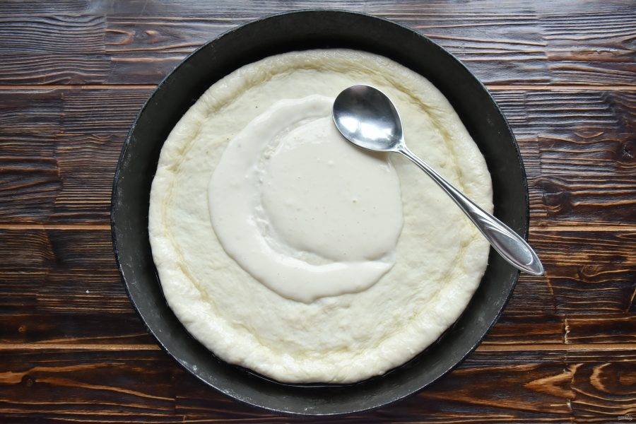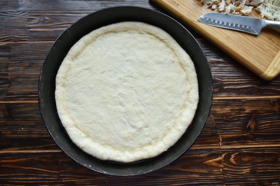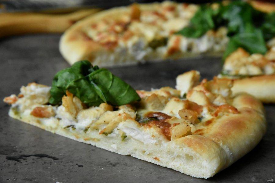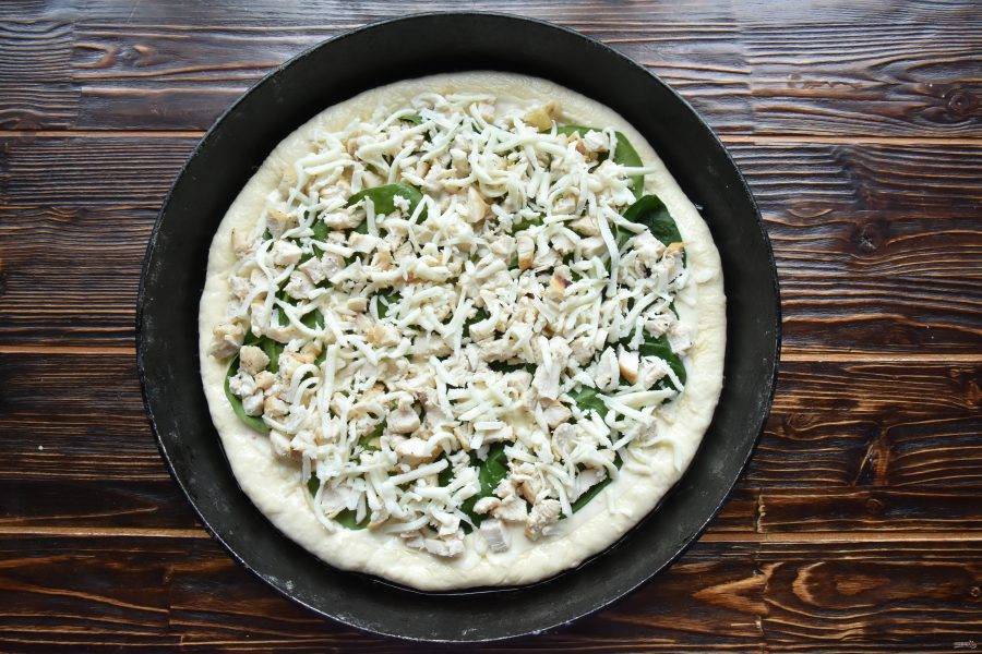 Сверху на соус выложите половину шпината, часть куриного филе и моцареллу. Края теста смажьте растительным маслом.