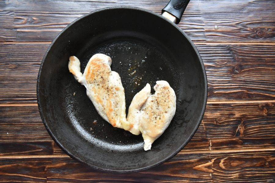Филе куриной грудки просушите бумажными салфетками, посолите, поперчите по вкусу.