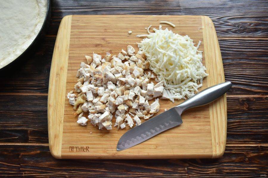 Готовое филе нарежьте кубиком. Шпинат промойте и просушите. Моцареллу натрите на терке.