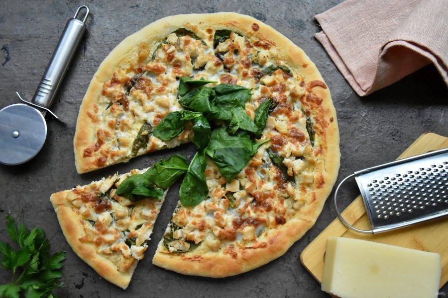 Выпекайте пиццу в духовке, разогретой до 230 градусов 12 минут. Затем достаньте ее из духовки. На горячую пиццу выложите горсть свежего шпината.