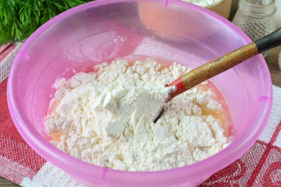 Всыпьте просеянную муку, добавьте по вкусу соль.