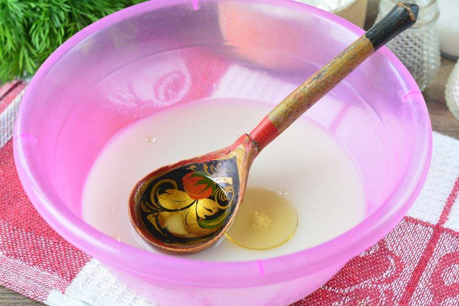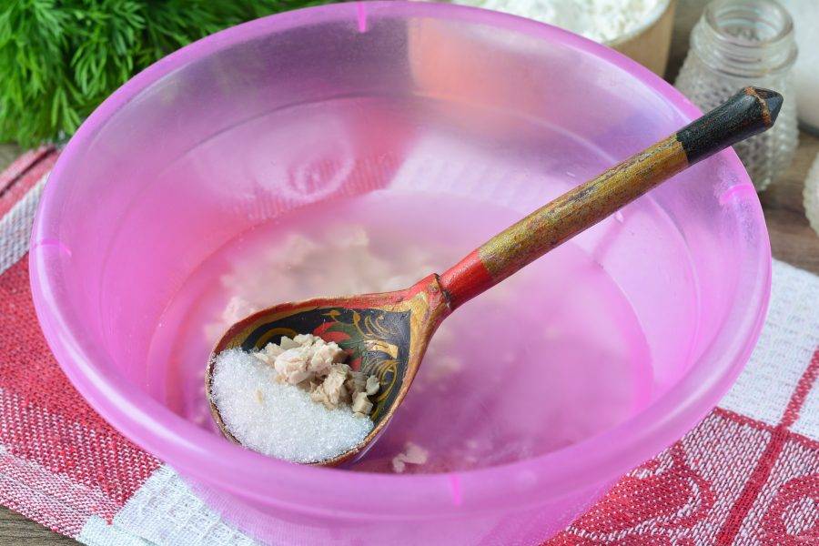 Для теста в теплую воду добавьте дрожжи и немного сахара (0,5 ч.л.). Размешайте.
