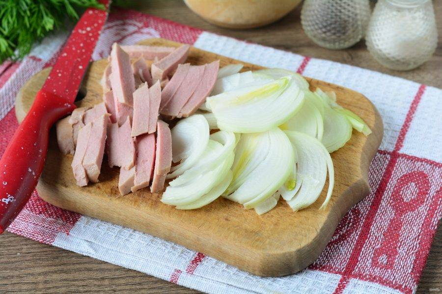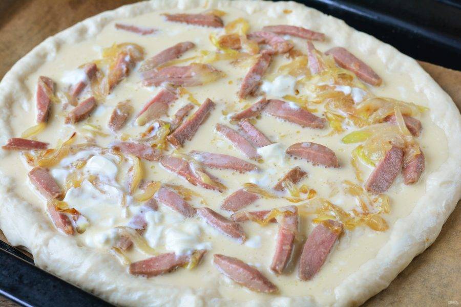 Раскатайте тесто, оставляя бортики по краям. Выложите начинку из лука и колбасы.