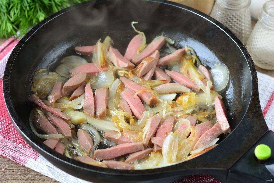 Добавьте в сковороду колбасу, жарьте все вместе еще пару минут и снимите с огня. Остудите.