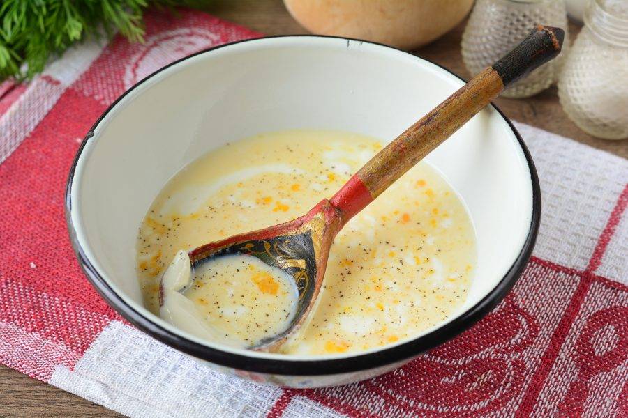 Перемешайте заливку. Добавьте соль и перец по вкусу.