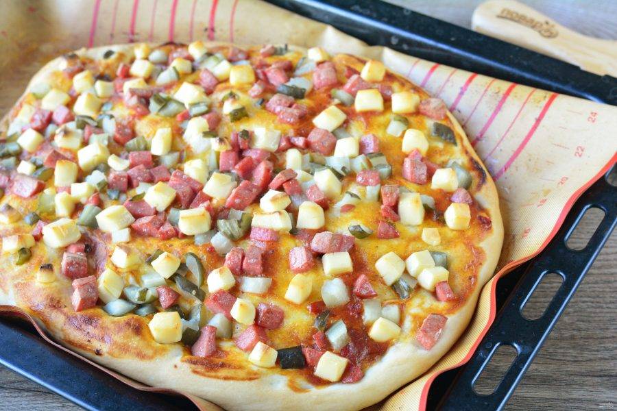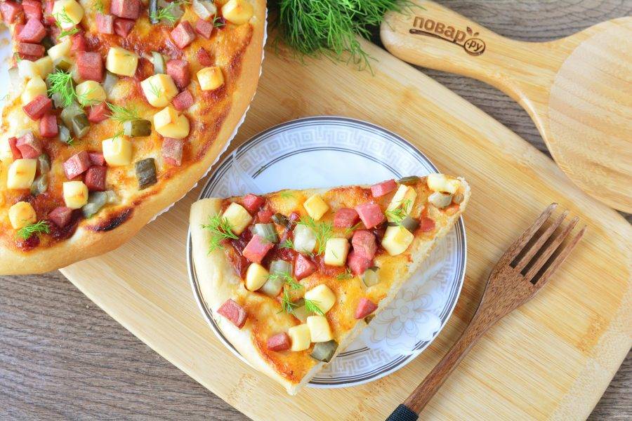 Готовую пиццу немного остудите и нарежьте на порционные кусочки. Приятного аппетита!