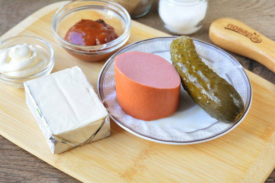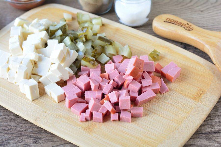 Для начинки нарежьте кубиками колбасу, соленые огурцы и плавленый сырок.