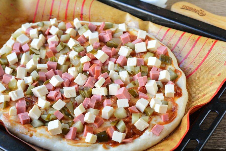 Пицца "Экономная" готовится из того, что есть в холодильнике. Тесто приготовьте дрожжевое на воде. Для начинки я использовала остатки вареной колбасы, соленые огурцы и плавленый сыр.