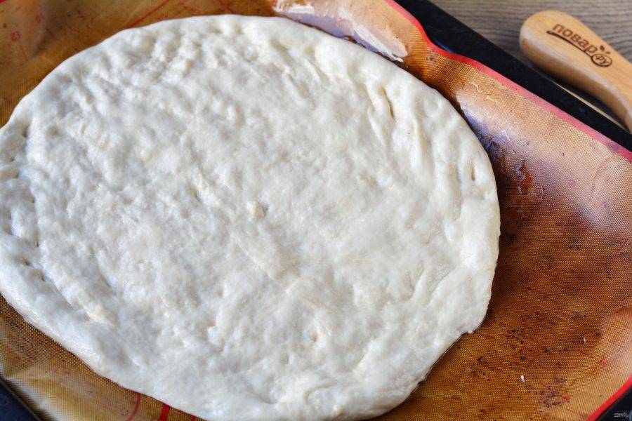 Смажьте руки маслом, выложите тесто на противень, разровняйте пиццу.