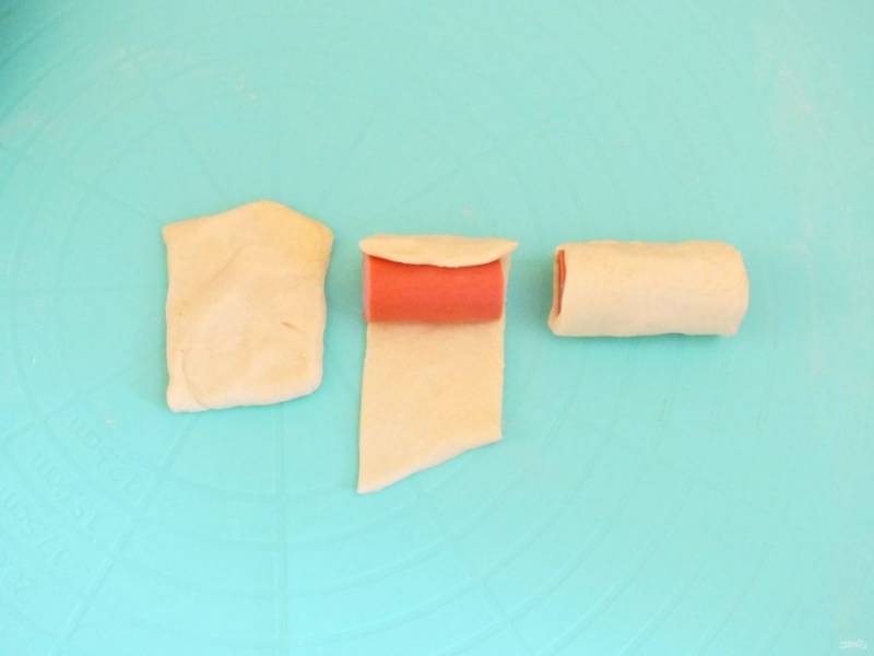 Оставшееся тесто разделите на небольшие кусочки, в которые можно завернуть сосиски. Каждую сосиску заверните в тесто. Место шва хорошо скрепите.