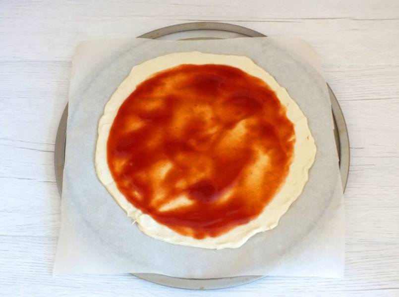 Основу для пиццы смажьте томатным соусом.