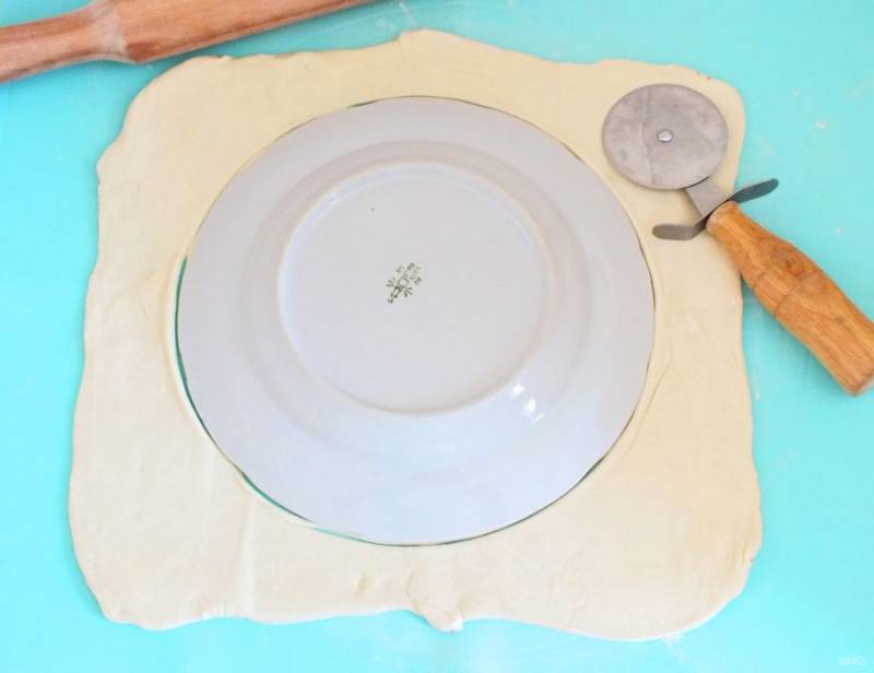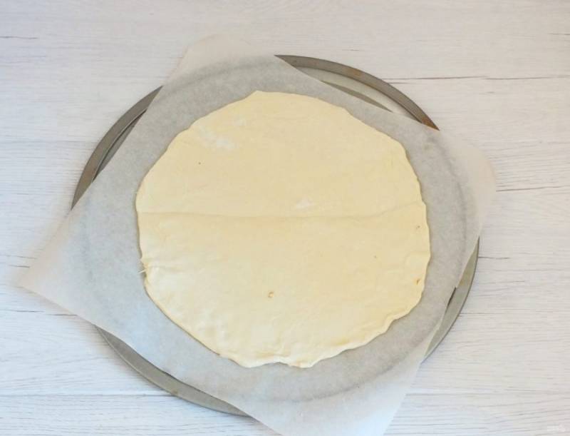 Размороженное тесто раскатайте на рабочей поверхности. Если оно прилипает, подпылите стол слегка мукой. С помощью тарелки вырежьте круглую основу. Диаметр 26-28 см. Оставшееся тесто отложите в сторону, оно пригодится.