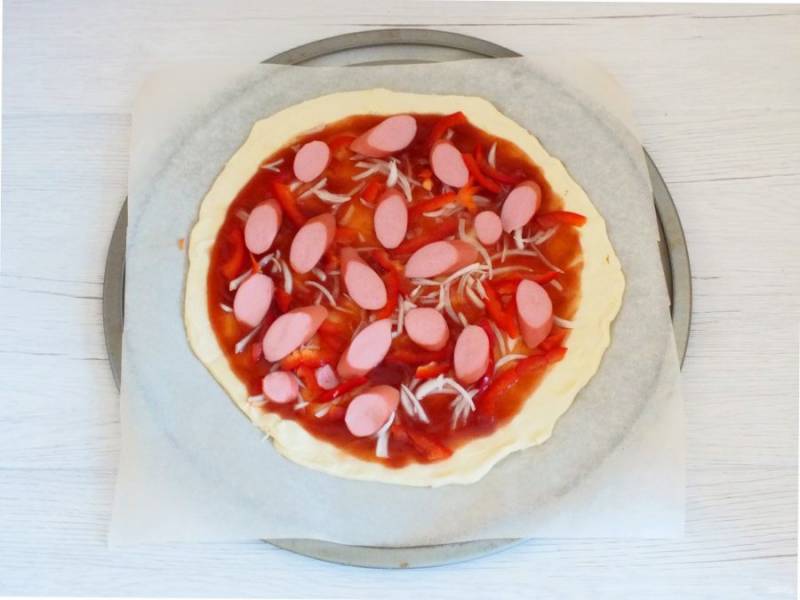 На соус разложите нарезанный тонкими перьями лук, нарезанный тонкой соломкой болгарский перец, нарезанную кругляшками одну сосиску.