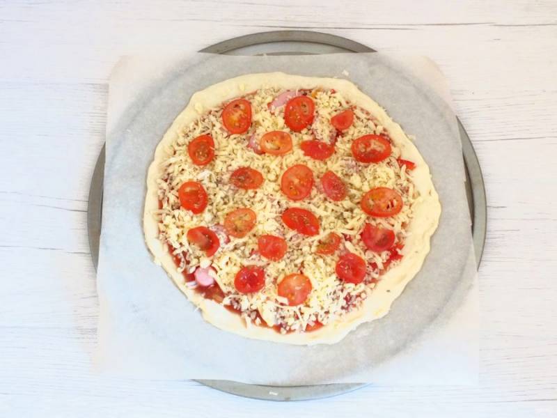 Покройте сыром основу с начинкой, сверху присыпьте специями, разложите нарезанные кругляшками помидоры черри.