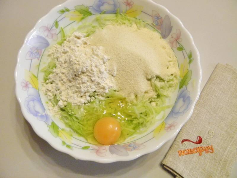 Затем добавьте к кабачкам муку, манную крупу и яйцо.