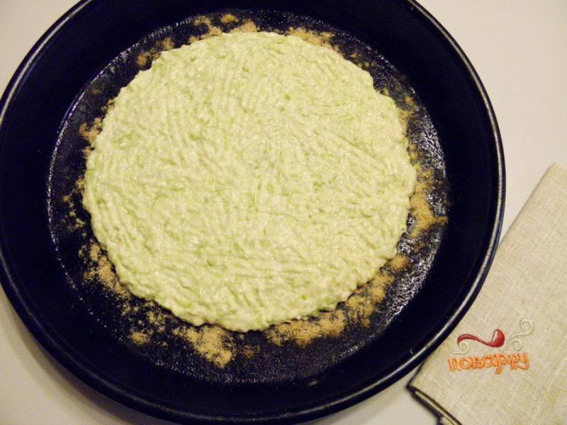 Выложите тесто в форму для запекания, предварительно смазав ее растительным маслом и присыпав панировочными сухарями.