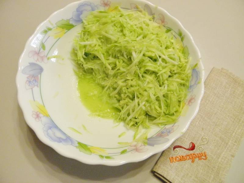 Дайте теперь кабачкам постоять 10-15 минут, а затем слейте отстоявшуюся жидкость. Она нам будет совершенно не нужна.