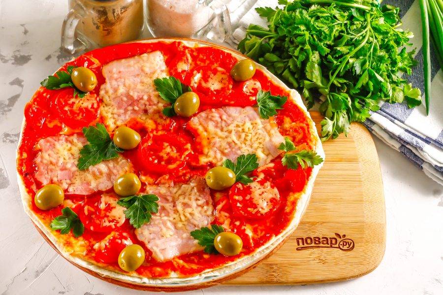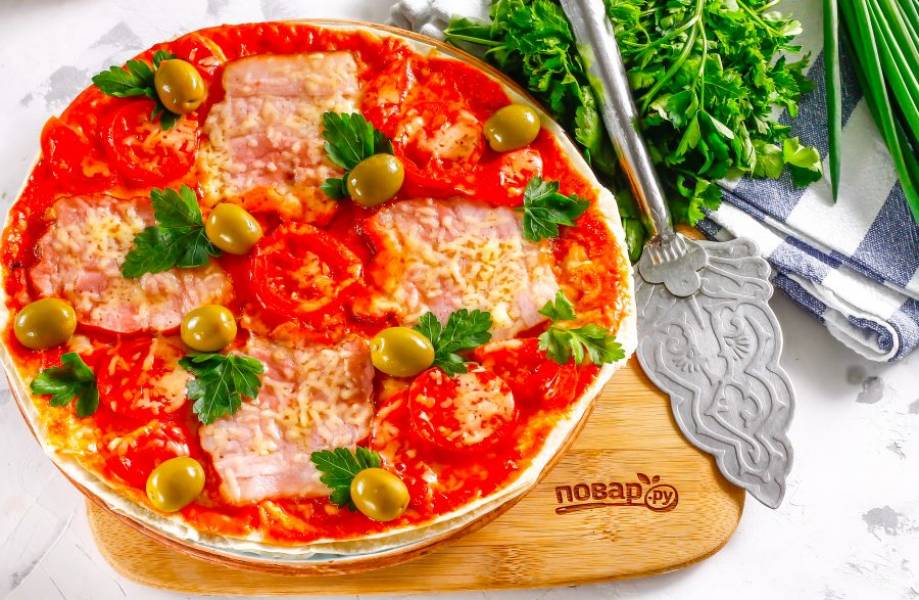Промойте помидоры и нарежьте их кружочками, бекон нарежьте ломтиками. Выложите на основу.