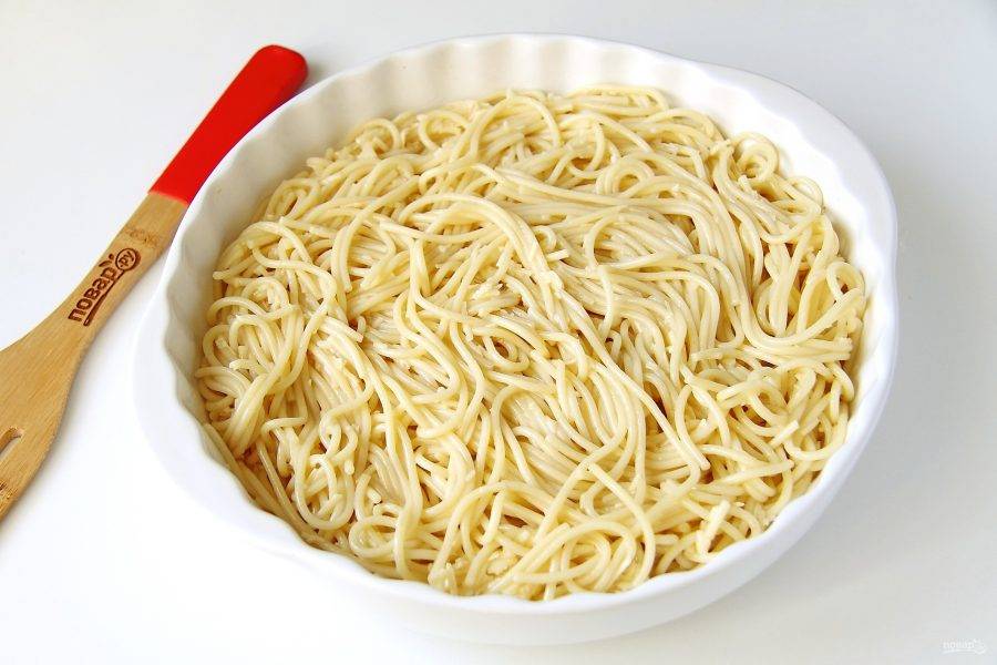 Отварите спагетти в подсоленной воде до готовности. Откиньте на дуршлаг. После того как стечет вся вода переложите в глубокую миску.
