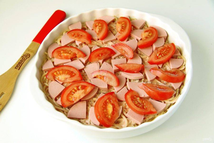 Сверху положите нарезанный дольками помидор или любые другие овощи по вкусу. Можно добавить грибы или обжаренный лук.