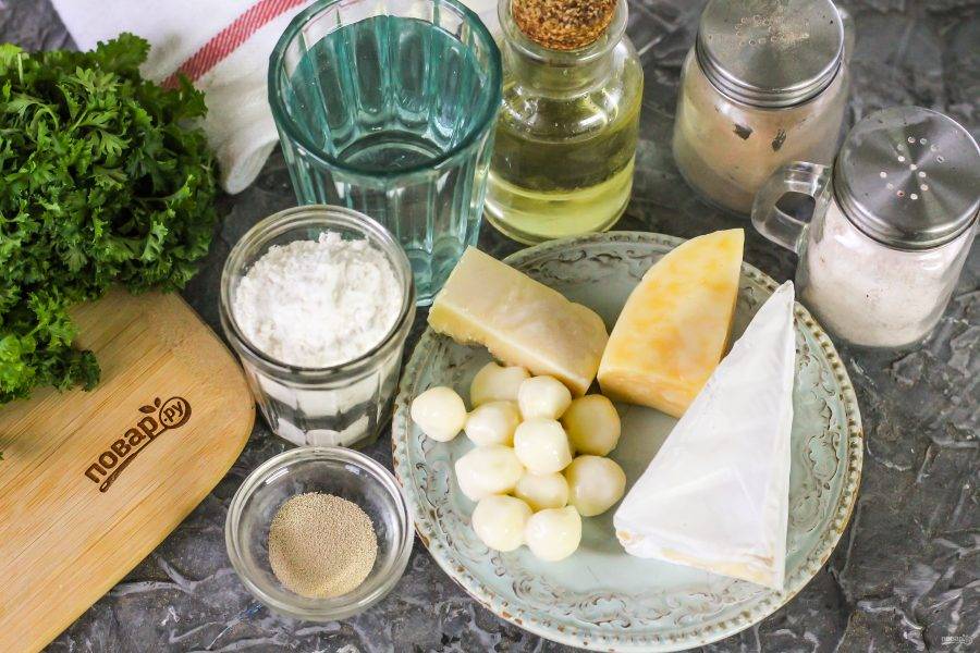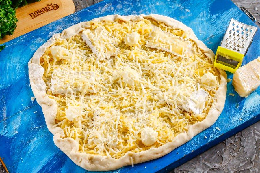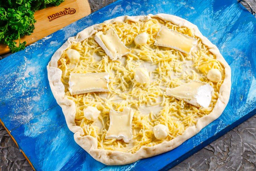 Нарежьте сыр "Бри" и выложите его вместе с моцареллой на основу из теста. Создайте бортик из теста, завернув его внутрь.