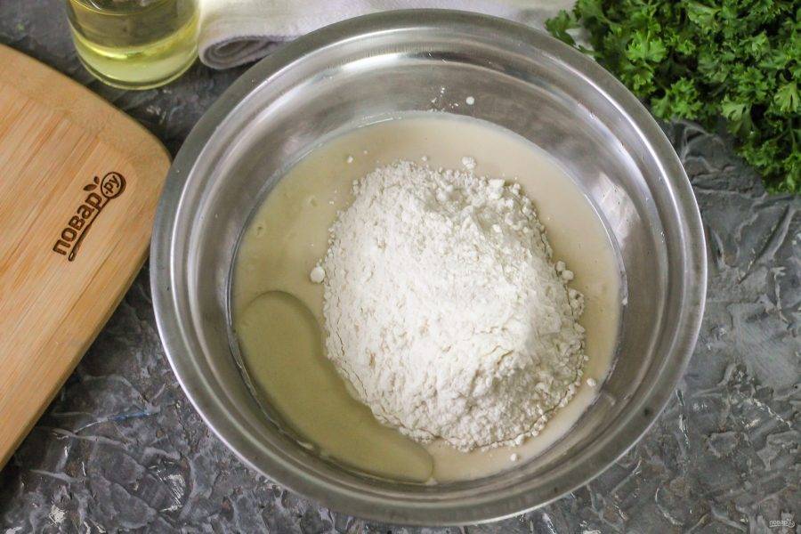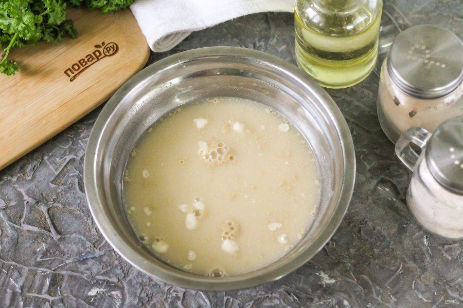 Соедините сухие дрожжи, 2-3 ст.л. муки, теплую воду и соль, смешайте. Оставьте на 15 минут для создания опары, накрыв полотенцем.