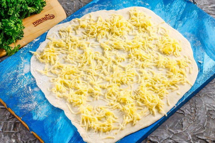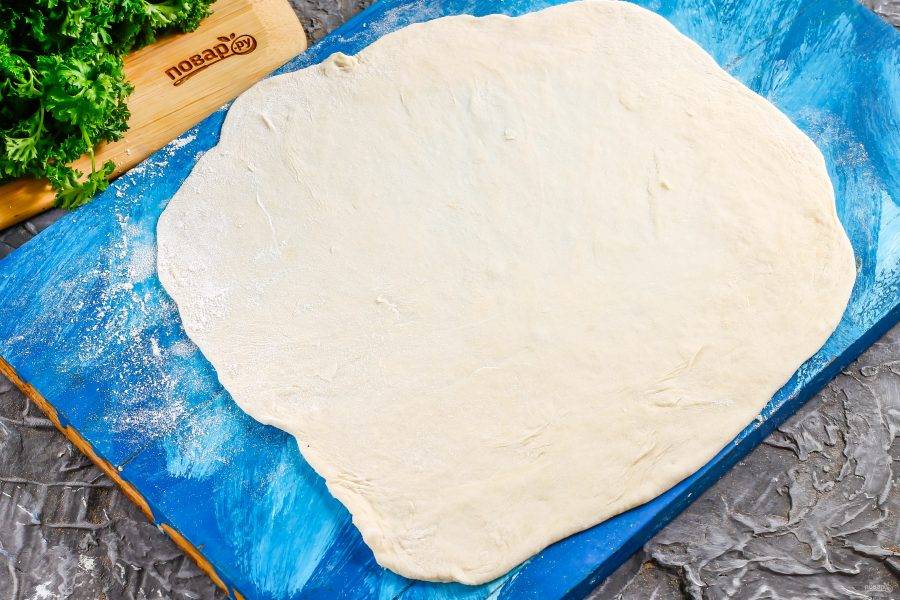 Затем раскатайте или растяните тесто в округлый либо прямоугольный пласт.