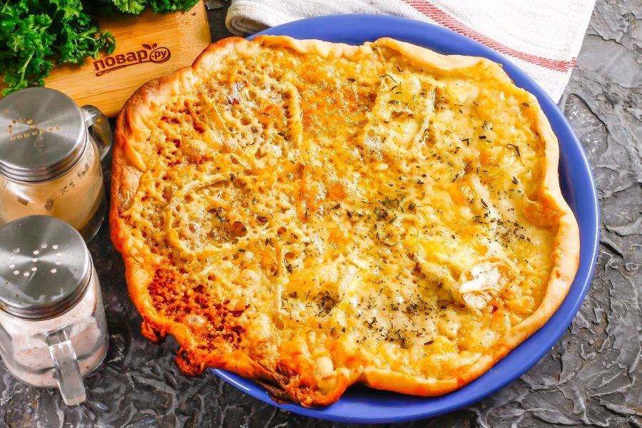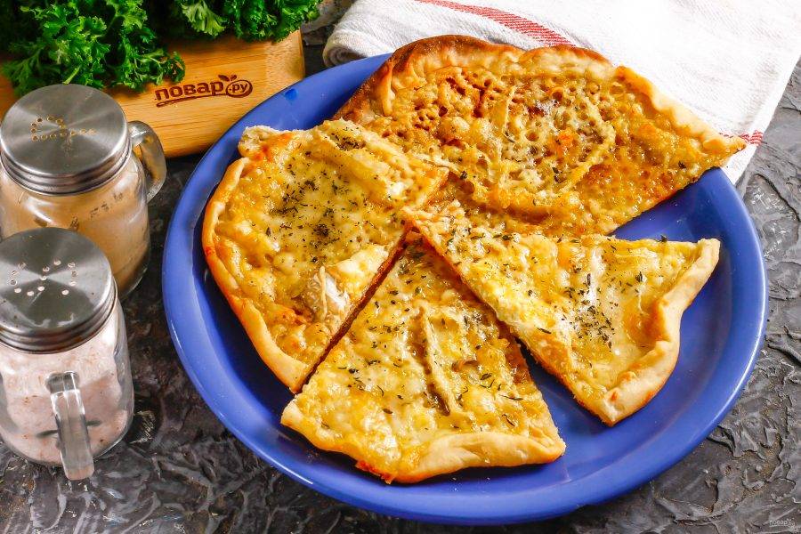Перед подачей сырную пиццу нарежьте порционными ломтиками и присыпьте измельченным тимьяном, орегано.