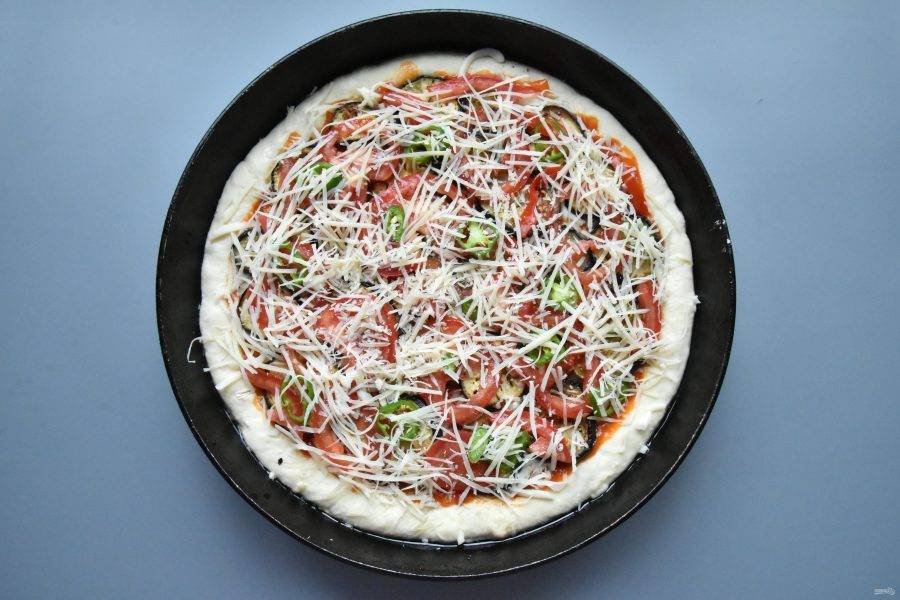 Поверх сыра плотно друг к другу распределите кружочки обжаренных баклажанов, кружочки помидоров и колечки острого перца. Сверху присыпьте все натертым пармезаном. Выпекайте пиццу в духовке, разогретой до 230-250 градусов в течение 12-15 минут.