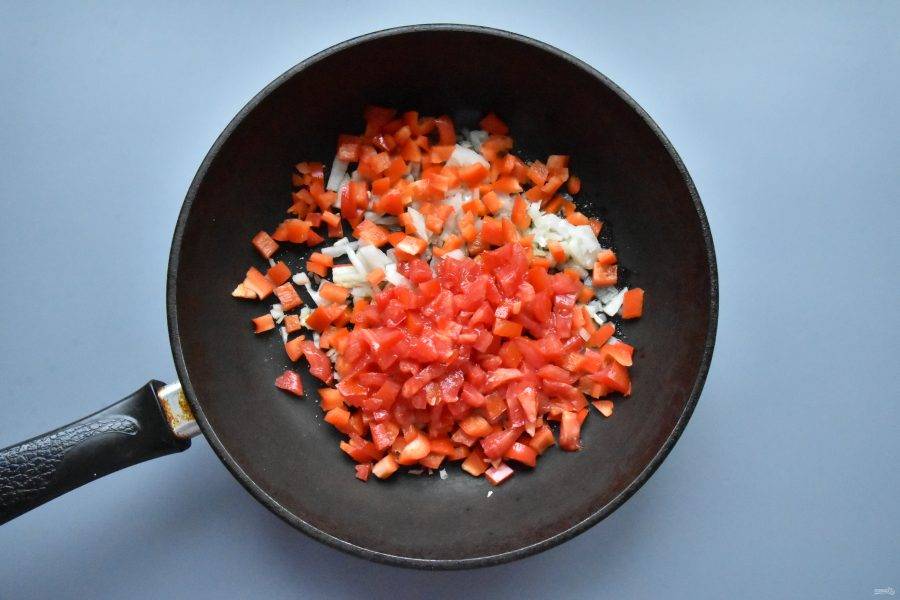 В первую очередь приготовьте соус. В сковороде разогрейте оливковое масло. Добавьте нарезанные кубиком овощи (лук, болгарский перец, помидоры), измельченный чеснок. Обжарьте на среднем огне 3-4 минуты, периодически помешивая.