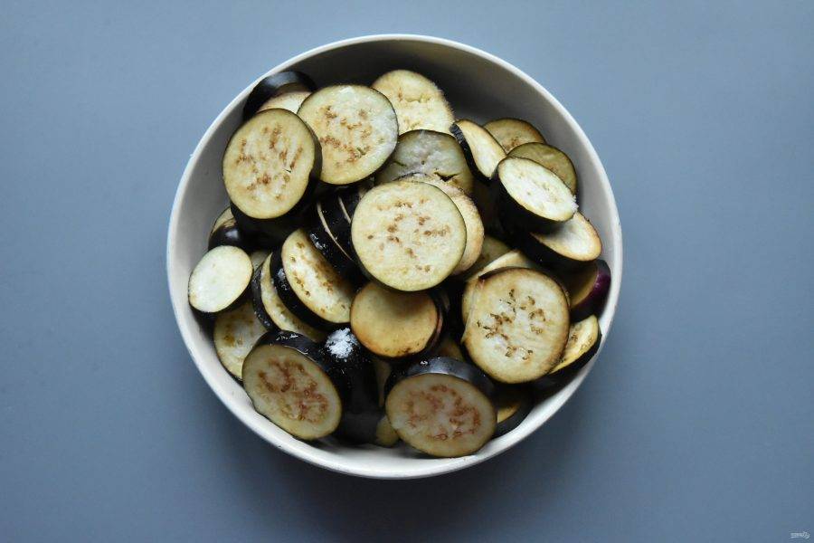 Баклажаны нарежьте шайбочками, толщиной 0,5-0,7 мм. и посыпьте солью. Оставьте на 30 минут до выделения влаги. После чего промойте и просушите на бумажном полотенце.