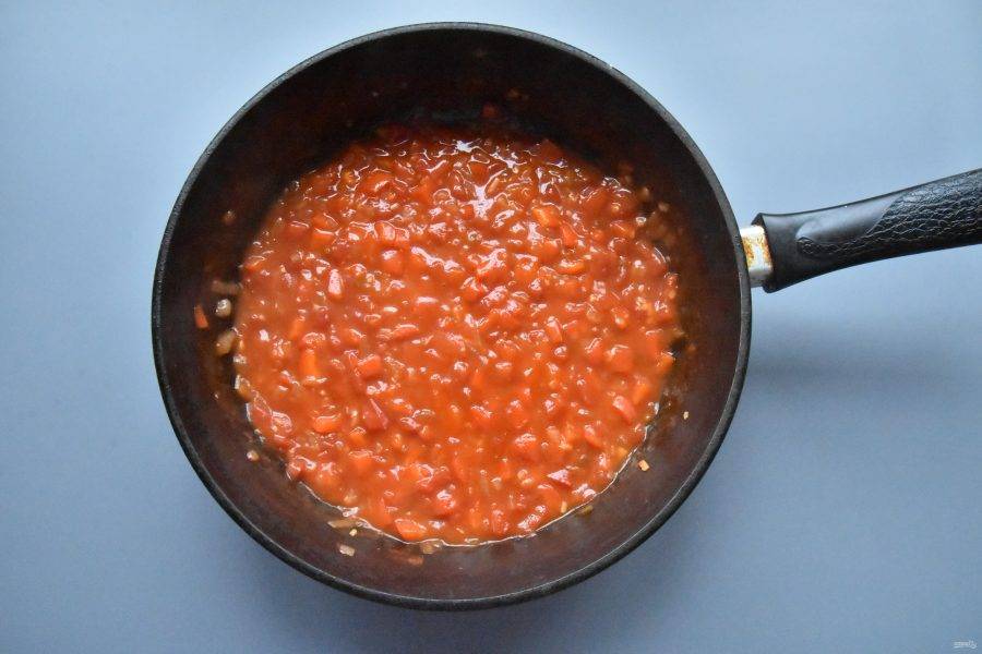Добавьте к овощам соль, травы и немного измельченного острого перца. Влейте томатный сок (томатную пасту, разведенную в стакане воды) или консервированные помидоры. Уварите соус до загущения, снимите с огня и остудите.