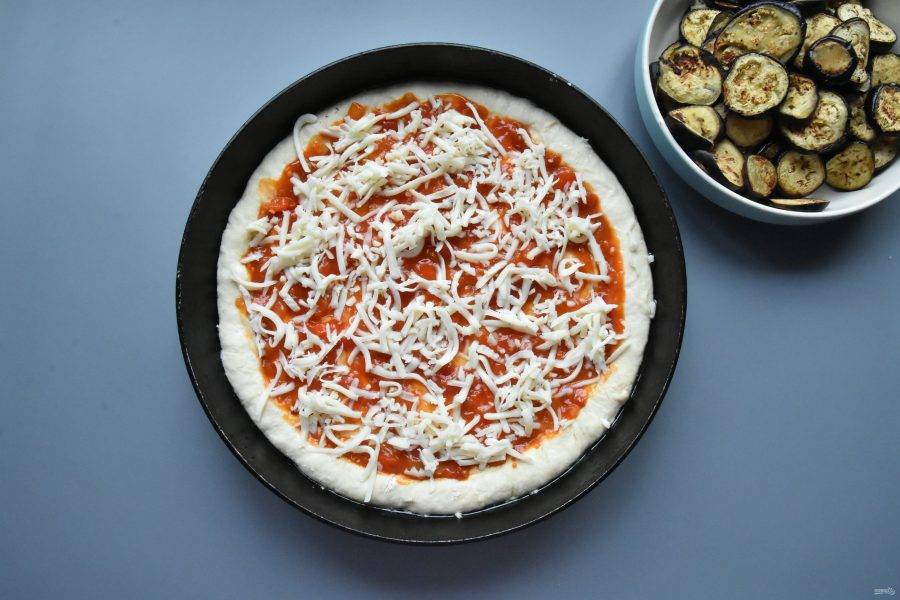 Баклажаны обжарьте в сухой сковороде или на гриле. По желанию можно слегка смазать сковороду растительным маслом, но совсем немного. Распределите по поверхности теста томатный соус. Сверху разложите натертую на терке или порванную на кусочки моцареллу.