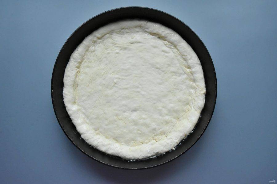 Распределите по форме тесто, формируя бортики. Края теста (бортики) смажьте небольшим количеством оливкового масла.